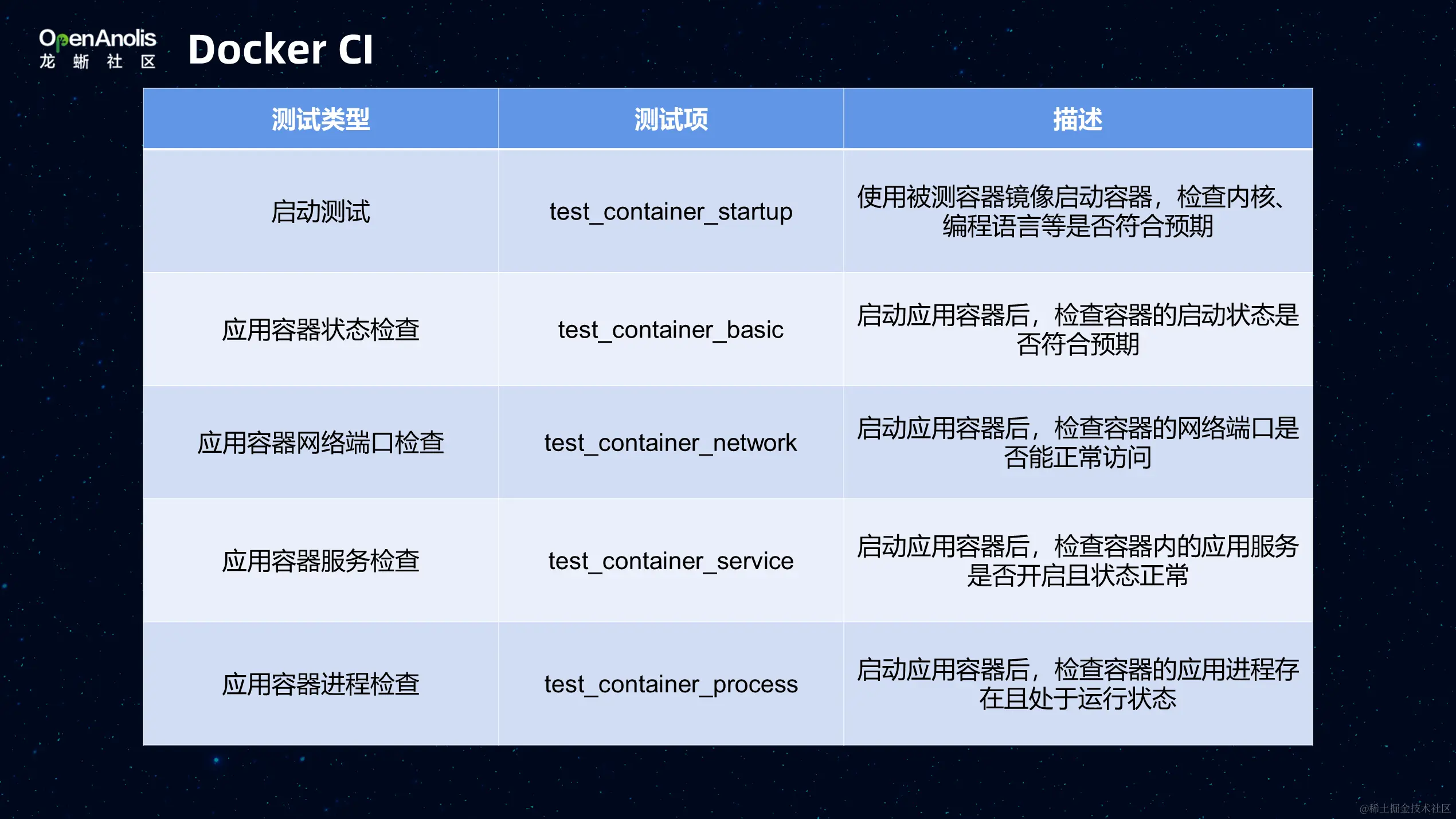 针对容器镜像的 Docker CI,检测 baseos、app、dragonwell、language 存放在 Gitee 和 Github 公开仓库的容器仓库,一旦有新的 PR,会检查 CLA 和容器的配置文件,检测没有问题后,会先通过 ABS 构建出测试使用的容器,由 T-One 做进一步测试,测试没有问题会合入,通过 ABS 构建出正式的镜像,推送到公网的镜像仓库中。