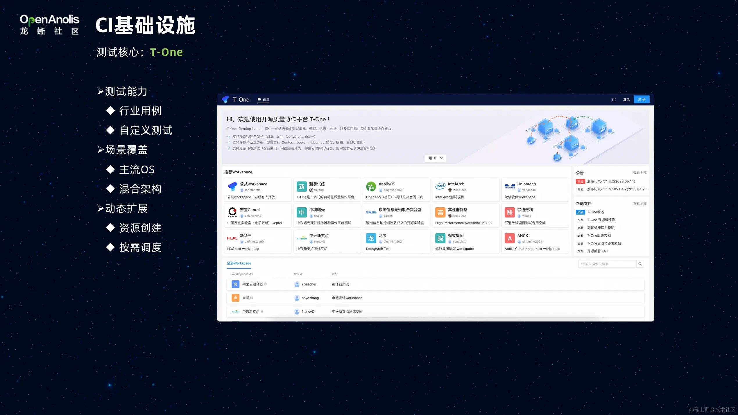 CI 基础设施中,有关测试方面的核心在 T-One 测试平台完成,该平台集成了行业内通用的测试用例,如模糊测试、性能测试用例等,也可以由社区开发者自定义一些测试用例加入到 T-One 中,实现自动化运行。目前,T-One 已覆盖业界主流通用 OS 以及混合的硬件架构测试,支持动态扩展,利用动态扩展创建云资源,并且作为测试资源使用。