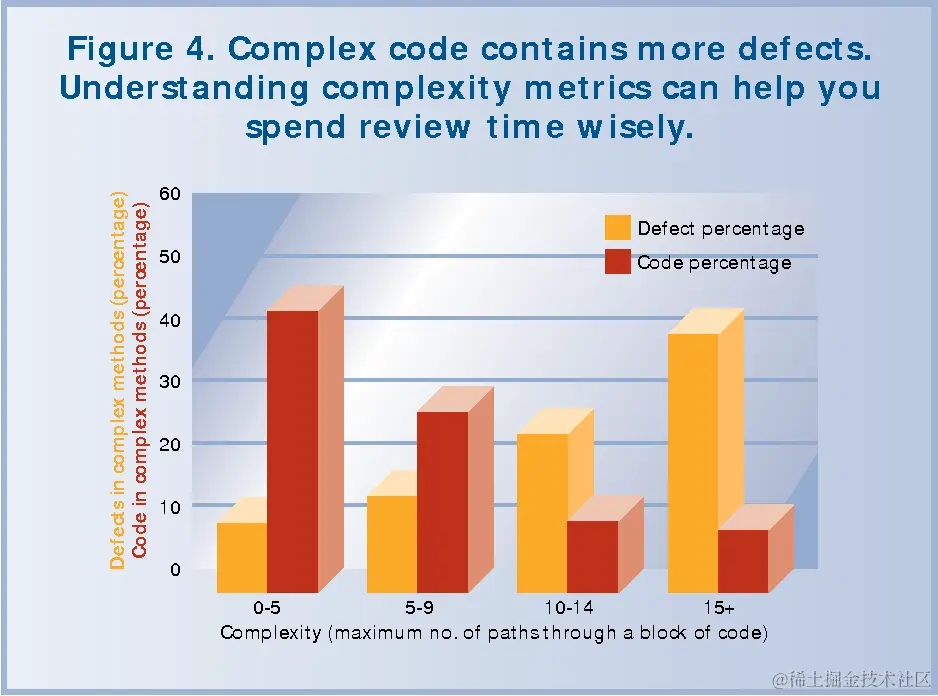 这是《A practical guide to object-oriented metrics》中的一个统计图,作者分析了一个数据库系统,黄色柱状体是缺陷的百分比,红色柱状体是代码的比例,横坐标标识了不同圈复杂度。最左边代码圈复杂度在0-5的时候,代码量占了总量的40%,缺陷数占了10%,而最右边圈复杂度为15+, 代码量占比10%,但缺陷数量占了缺陷总数的40%+。从左向右的可以看到代码的圈复杂度越高,缺陷的比例也越高。