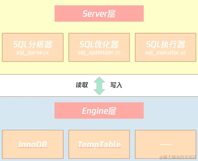 我们通过上图可知,MySQL数据库是由Server层和Engine层组成。