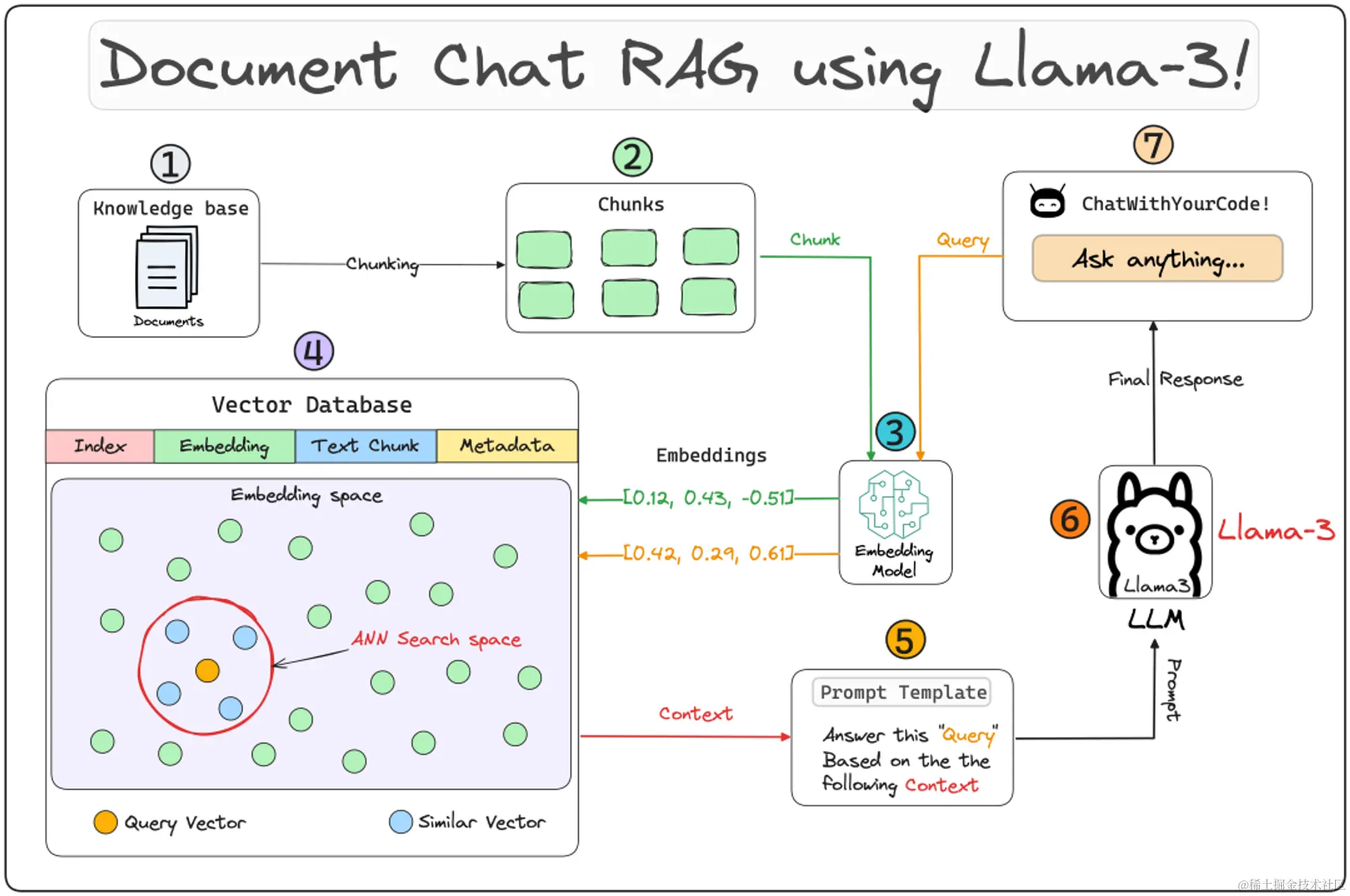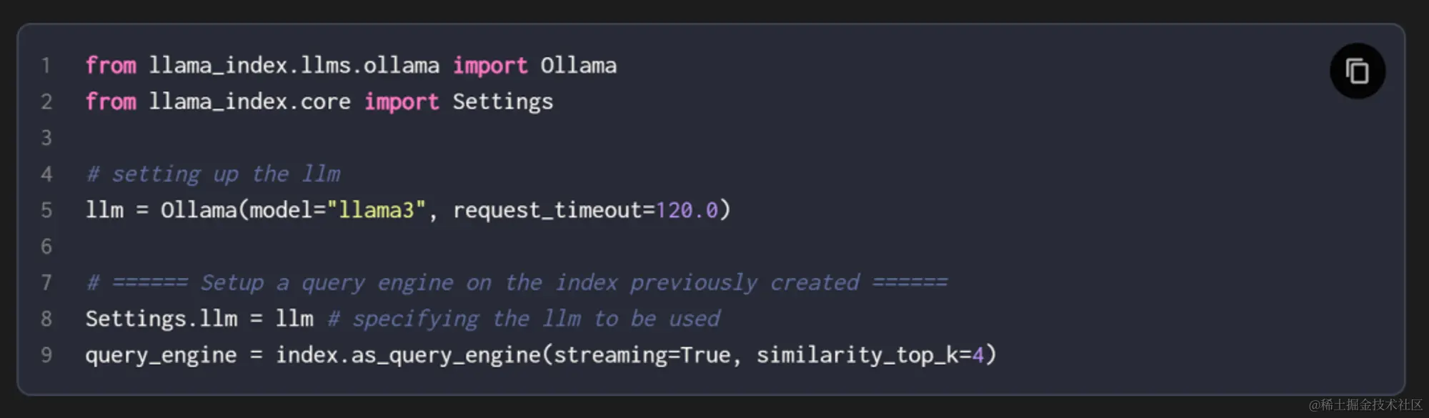 查询引擎获取查询字符串,使用它来获取相关上下文,然后将两者一起作为提示词发送给 LLM 以生成最终的自然语言响应。这里使用的 LLM 是Llama-3。