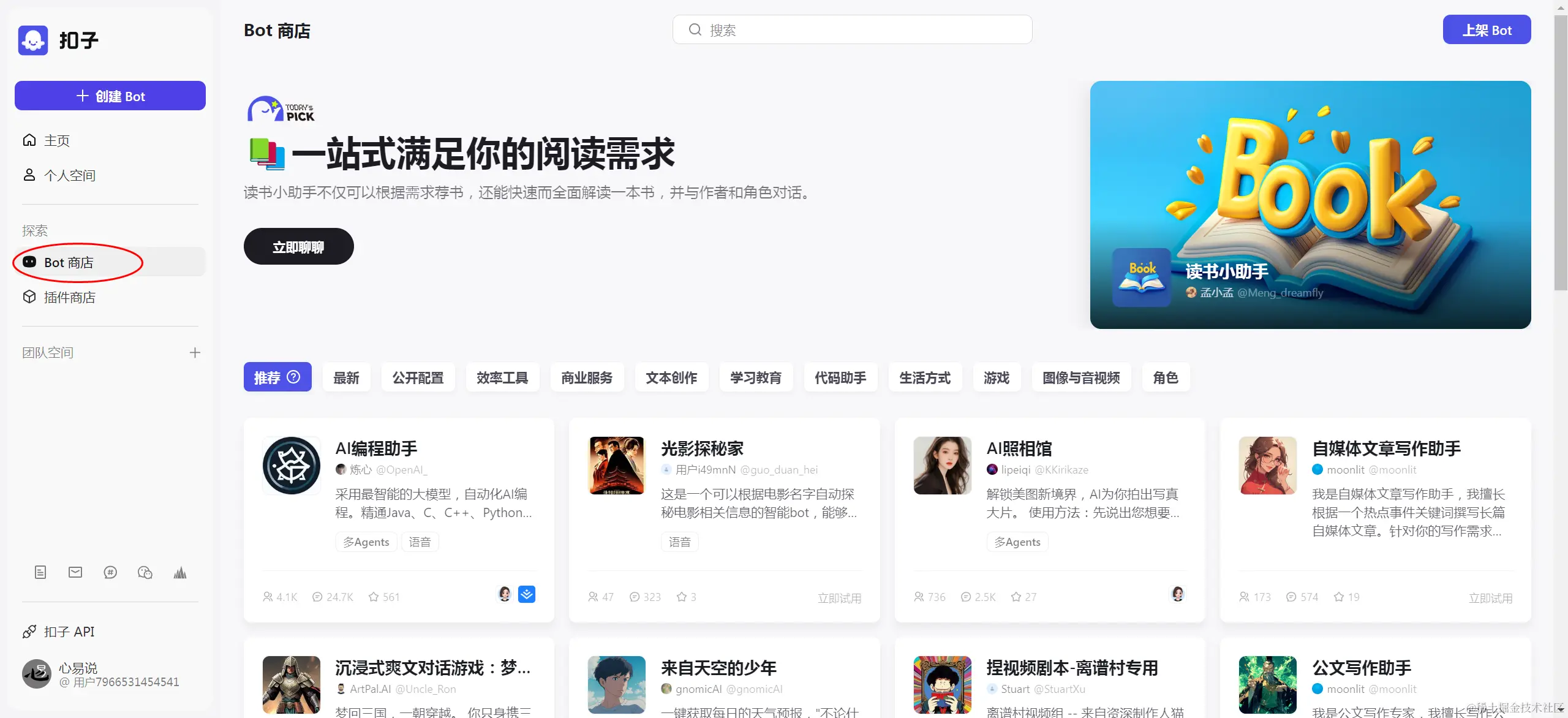 登录后,你将看到Coze的首页。在这里,你可以探索Coze的各种功能。