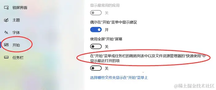 (3)关闭【在“开始”菜单或任务栏的跳转列表中以及文件资源管理器的“快速使用”中显示最近打开的项】。