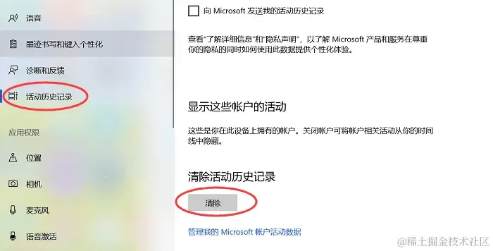(2)选择 【活动历史记录】 ,找到【清除活动历史记录】,点击【清除】 。
