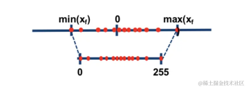 - 按照浮点数和整数的范围比例,对浮点数进行缩放