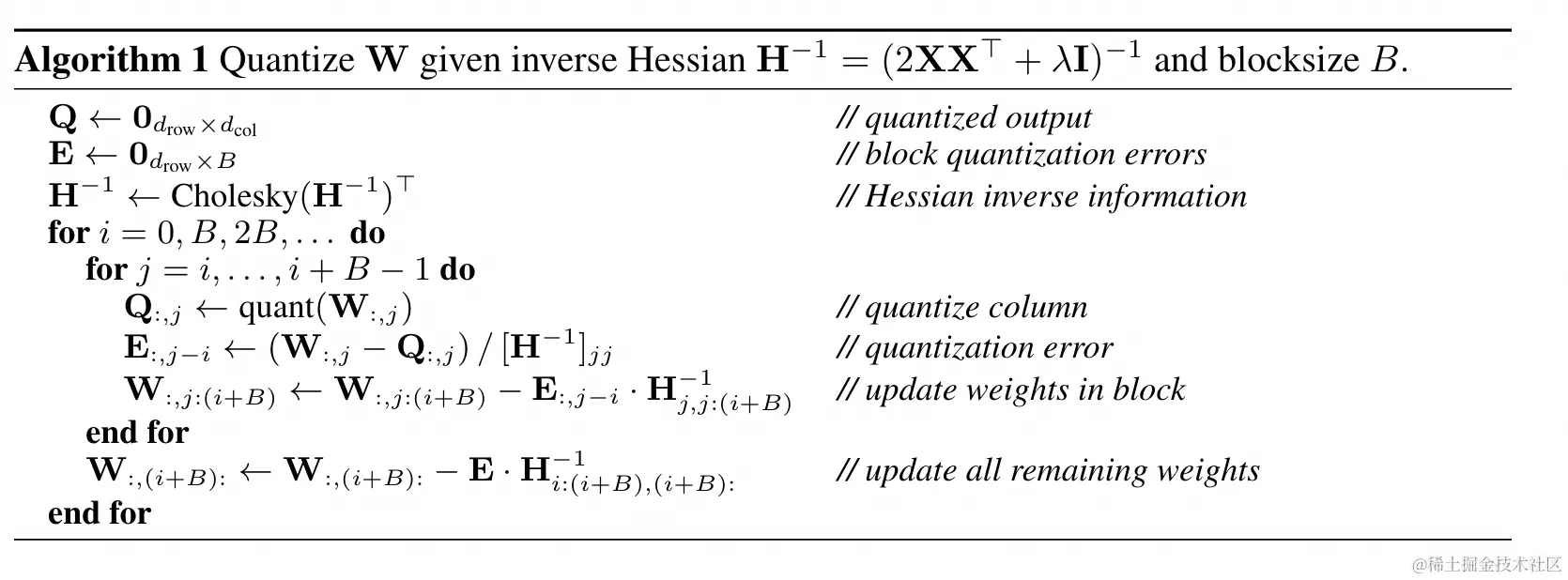 - 按照OBQ的公式,每次量化一个参数后需要更新整体参数矩阵,但是对当前列进行量化时,后面的列参数对当前的量化无影响,而是受到当前列量化的影响(当然这是个近似估计)。因此可以按照B=128进行分块,使得块内部参数立即更新,块外部的后续列只是暂时记录更新的值,等128列整体更新完成,在一起更新后续的列参数。这样可以高效利用GPU的并行计算能力,减小吞吐压力。