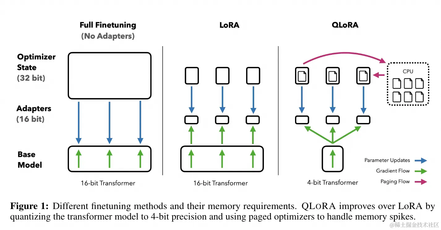 而在QLoRA论文中,作者介绍了4bit量化、双重量化和分页optimizer的技术方案。