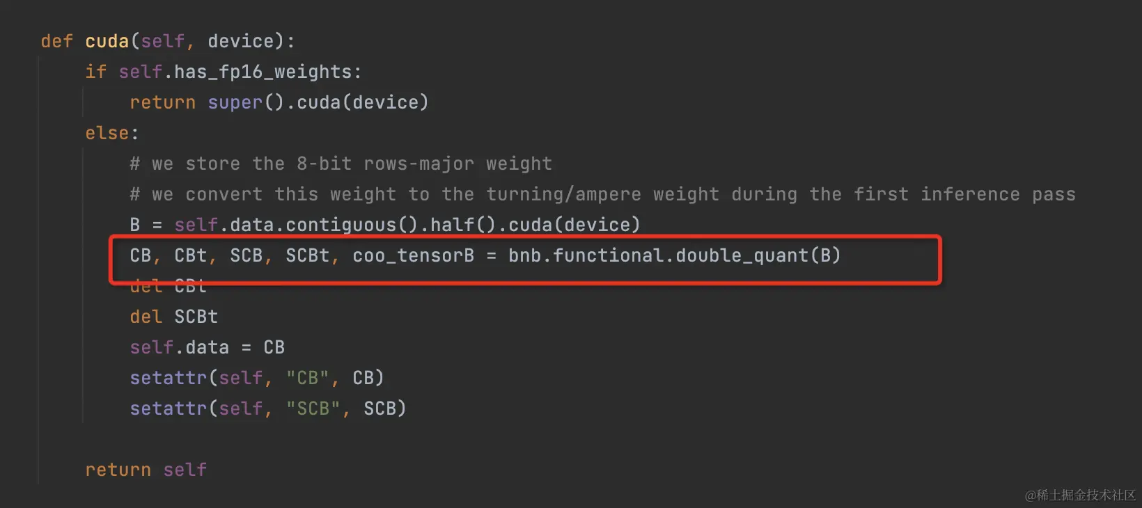 双重量化。可以看到在weights迁移到cuda的时机进行量化。
