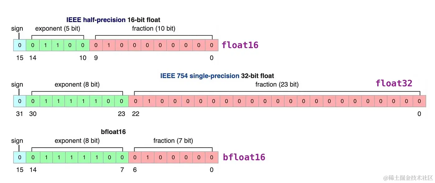 低精度浮点数:在PyTorch中用torch.bfloat16和torch.float16表示。这两个浮点数的差别在上图中可以表示: