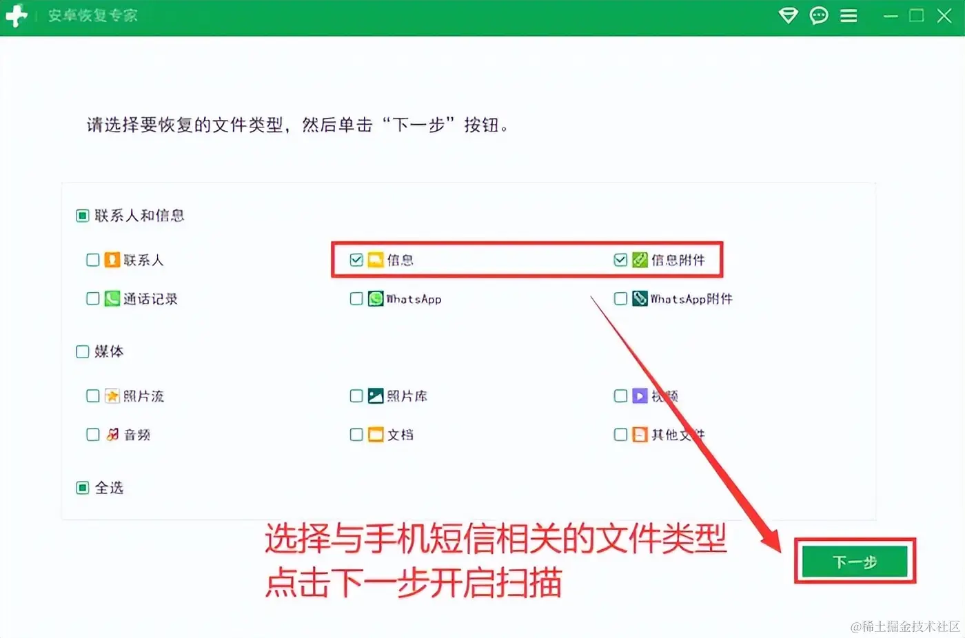 步骤2:在软件界面上选择您想要恢复的数据类型,即 【信息】 和 【信息附件】 ,然后下一步软件将开始扫描您的设备。这个过程可能需要一些时间,具体取决于设备内存的大小。
