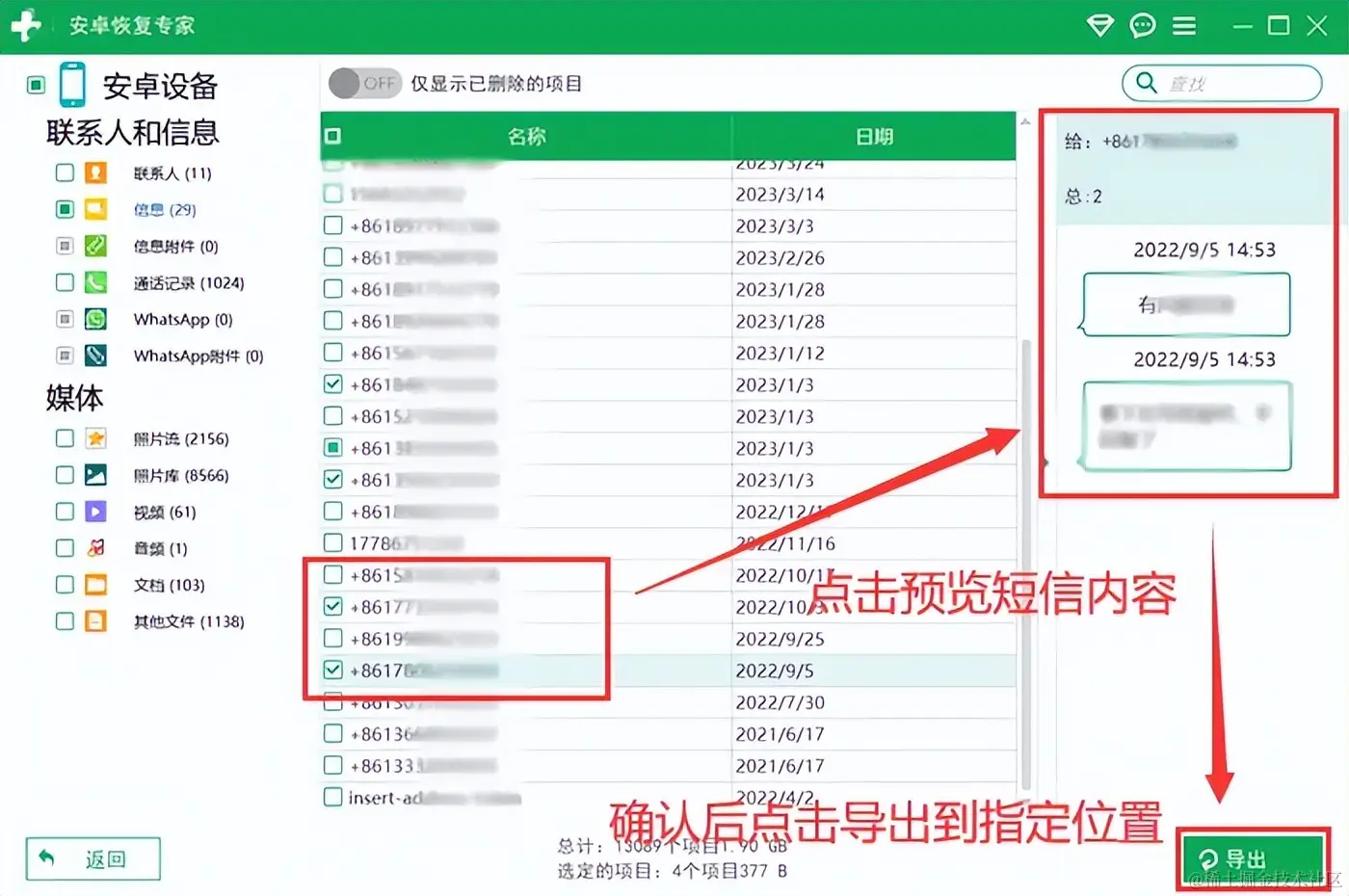 步骤3:扫描完成后,您可以在软件界面上预览被删除的短信内容,然后勾选您想要恢复的数据,选择一个安全的位置导出数据,以防止再次误删。