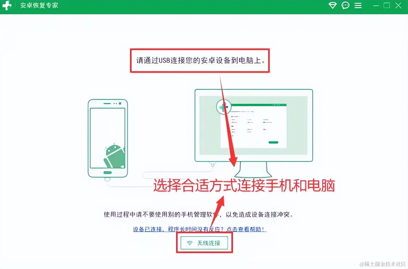 步骤1:用户需要在官网下载并安装安卓恢复专家,然后按照软件的指示进行操作,将安卓手机连接到电脑。