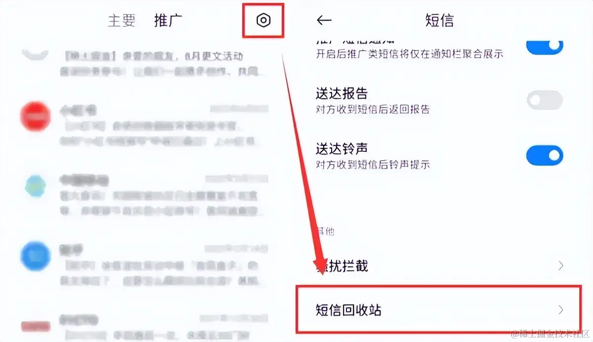 步骤2:在设置中找到回收站,进入查询最近删除的短信并点击还原。