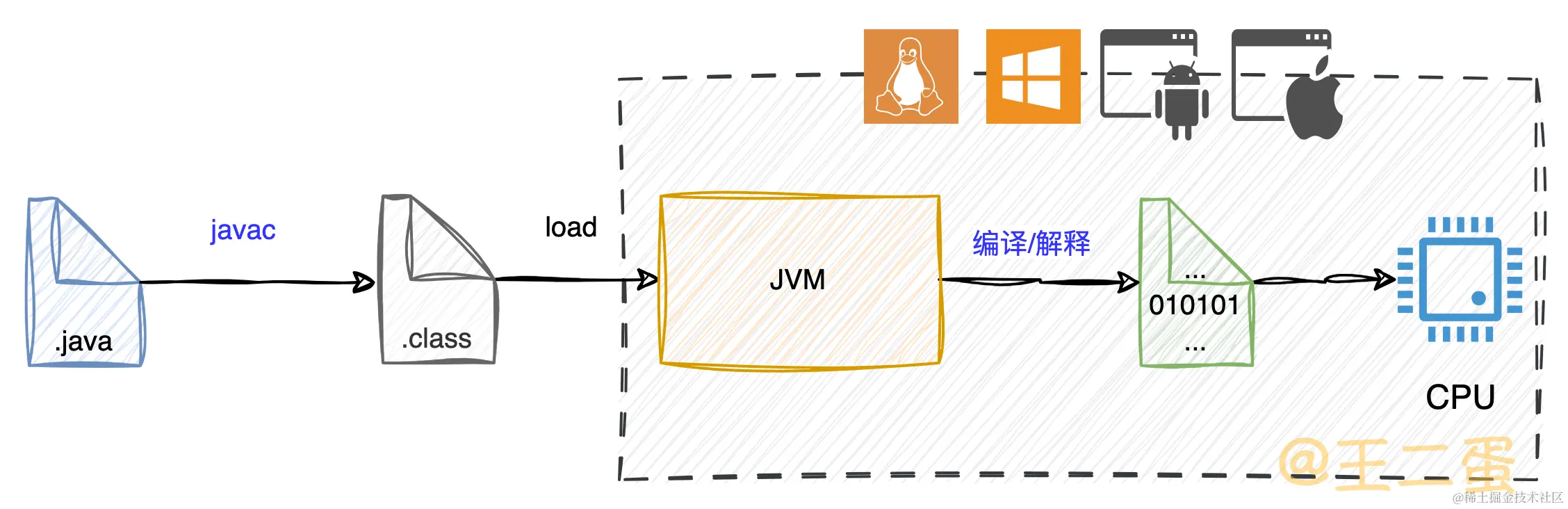 - Java语言编写的程序会被编译为Java字节码,也就是JVM自身的指令。运行时,JVM会将指令转换成本地机器指令,从而实现跨平台。