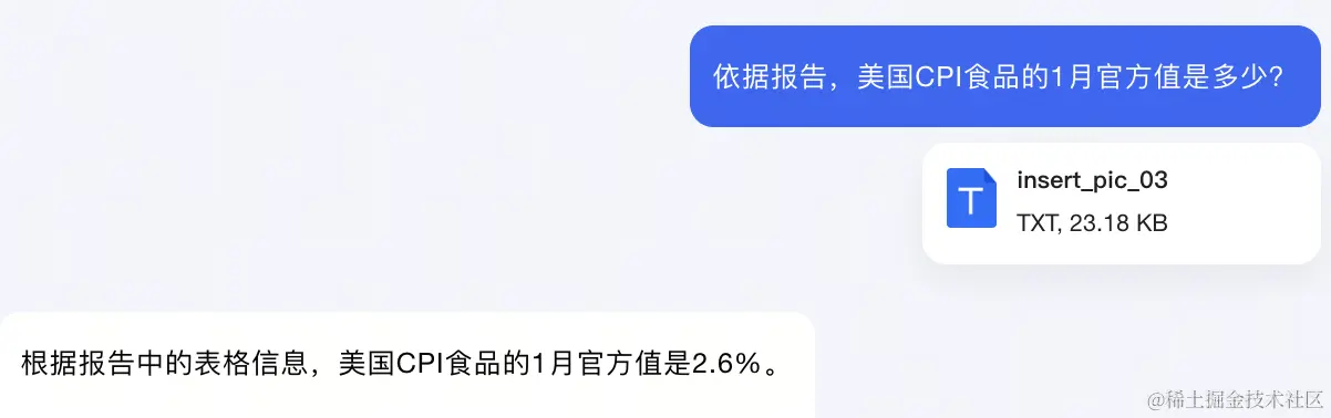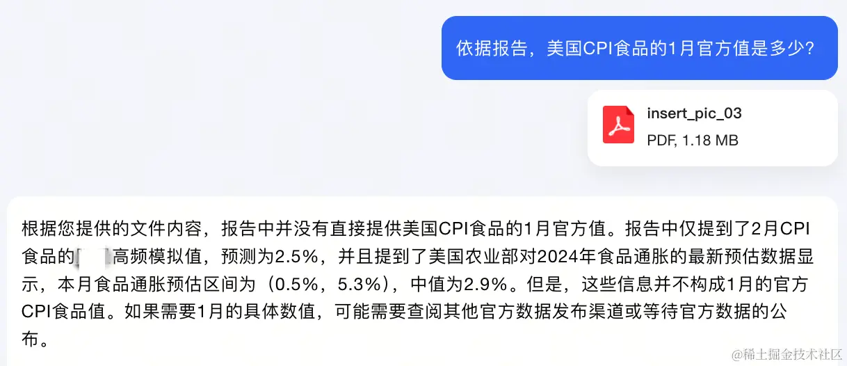 我们来尝试一份包含数据与图表的经济报告。上传报告后,合小研提出问题:依据报告,美国CPI食品的1月官方值是多少?