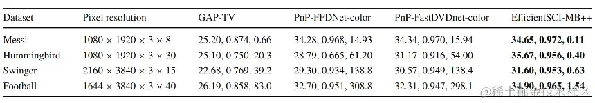 3. 从表 1 可以看出,EfficientSCI++ 第一次在 1644×3480×3,压缩比为 40 的大尺度彩色仿真测试数据上给出 34dB 以上的重建质量;