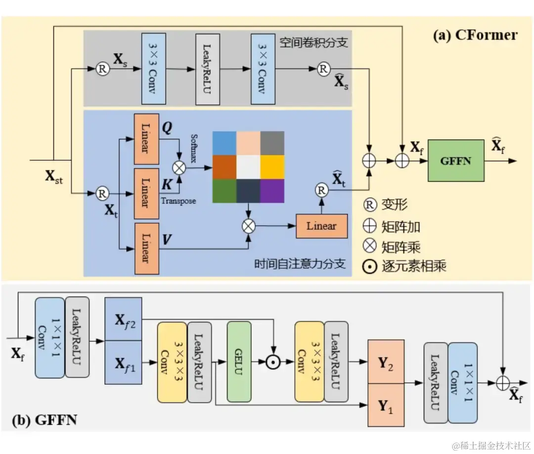 不难看出,CFormer 块在 ResHNet 块中起到至关重要的作用。如图 3 所示, CFormer 块基于时空分解机制和 CNN-Transformer 架构,其主要包括: