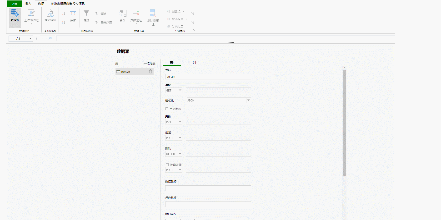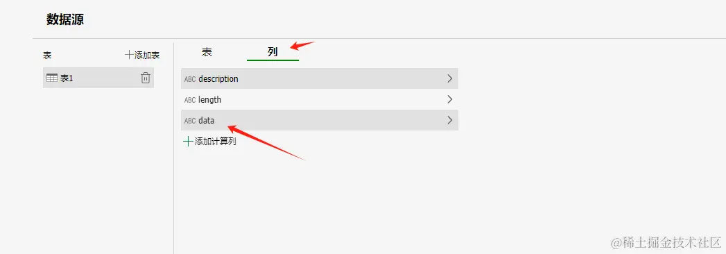 观察上图,我们依次点击”数据“---->”数据源“ ,发现已经有了一个person表,而且读取的input是置灰不允许编辑的,此时点击下”列“,看下字段信息
