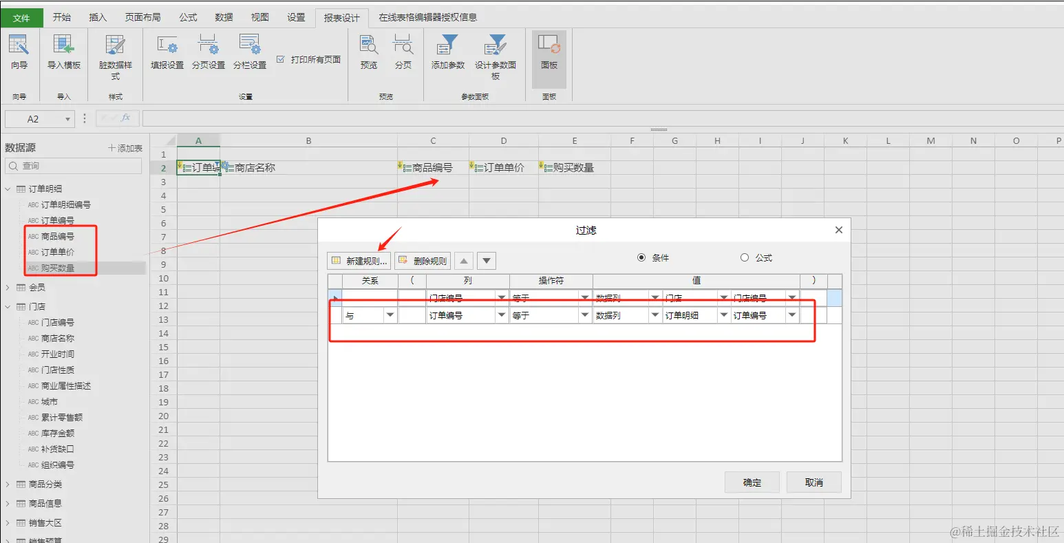 将”订单明细“表中的”商品编号“,”订单单价“,”购买数量“ 依次拖拽进C2、D2、E2单元格。并且选中A2单元格,选择“面板”进行过滤,然后在右侧的单元格属性中设置“过滤”条件,如下图所示: