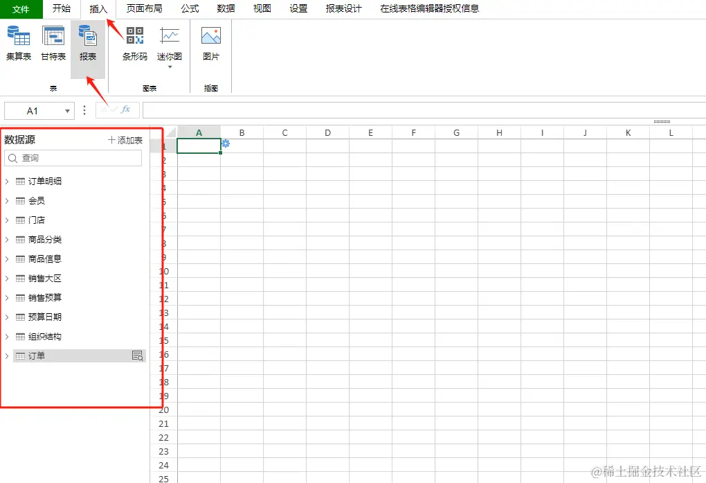 依次点击“插入”,“报表”,可以看得到左侧有数据源列表: