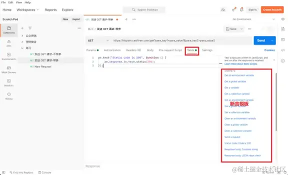 Postman 中 的这些前置和断言脚本都是 JavaScript 脚本,如果会 JS 语法的话,是可以自己写这些脚本的,但是 Postman 当中也为提前封装好了一些常用的方法,不需要去掌握 JS 语法,就可以轻松使用这些预置好的脚本。