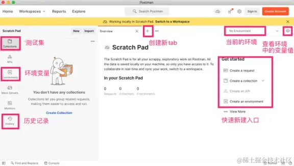 - 一般来说测试接口肯定是要会有很多套环境的,比如说生产环境、测试环境,正式环境等等。在 Postman 中可以通过设置不同的环境变量,很方便的使用同一套测试用例,只是切换到不同的测试环境就可以。