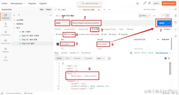 选择 Body--form data,key 值填写 form_key1,value 填写 form_value1