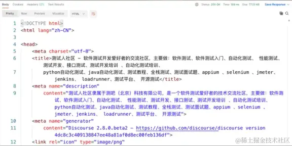 - Pretty 会根据选择的类型对 Body 进行高亮显示,同时可以选择要不要自动换行,方便阅读。比如之前请求测试人社区首页的时候,返回的响应是 HTML,那 pretty 中显示的 HTML 内容就是语法高亮和美观的格式。后面响应是 JSON 格式的时候也是同样。一般来说直接默认查看 pretty 中的响应结果就可以。