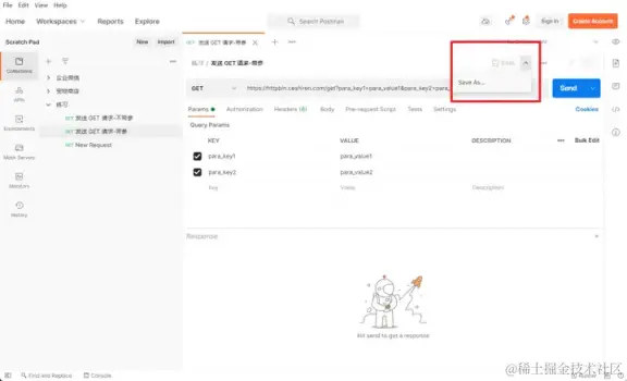 - Save as: 可以保存 请求的名字以及简单的描述。还可以决定要不要把请求保存到 Collection 里面去。