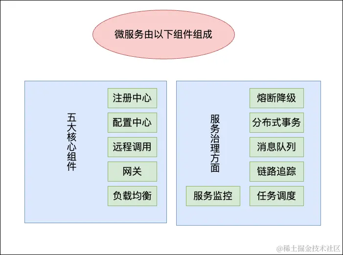 总的来说微服务分为服务核心组件和服务治理两个方面,架构图如下: