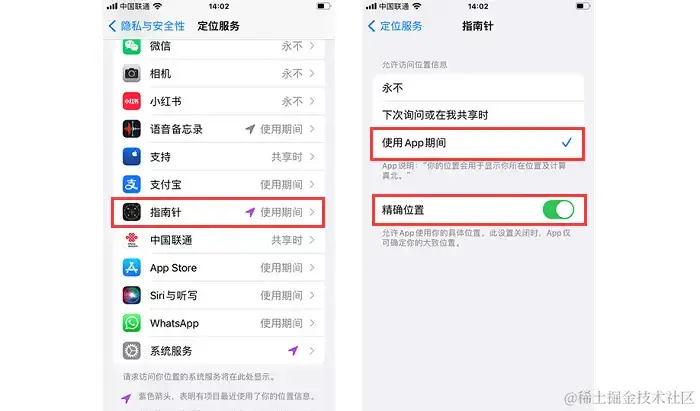 步骤3:然后在**【定位服务】界面下滑,找到并轻点【指南针】,勾选【使用App期间】,并把【精确位置】**的按钮给打开。