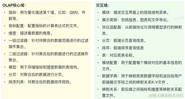 经过上面的抽象,框架方面,可以划分为核心OLAP域以及面向前端及配置的交互域,并提取出领域模型: