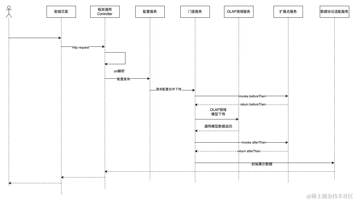 框架会组合前端请求参数和后端配置项,通过门面服务区分请求类型(表格、图表和文件导出),将最终的OLAP领域模型下传到OLAP领域服务,由OLAP领域服务将领域模型翻译为底层OLAP数据库可以执行的SQL,并将结果统一按照特定格式返回,通过数据协议适配服务,根据请求的类型返回数据给前端。