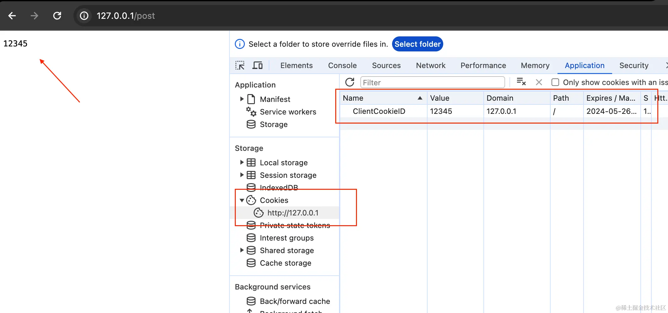 这时我们查看浏览器本地的存储列表,已经发现已经将服务端响应 Set-Cookie 头已经存到了本地,在进行第二次请求。