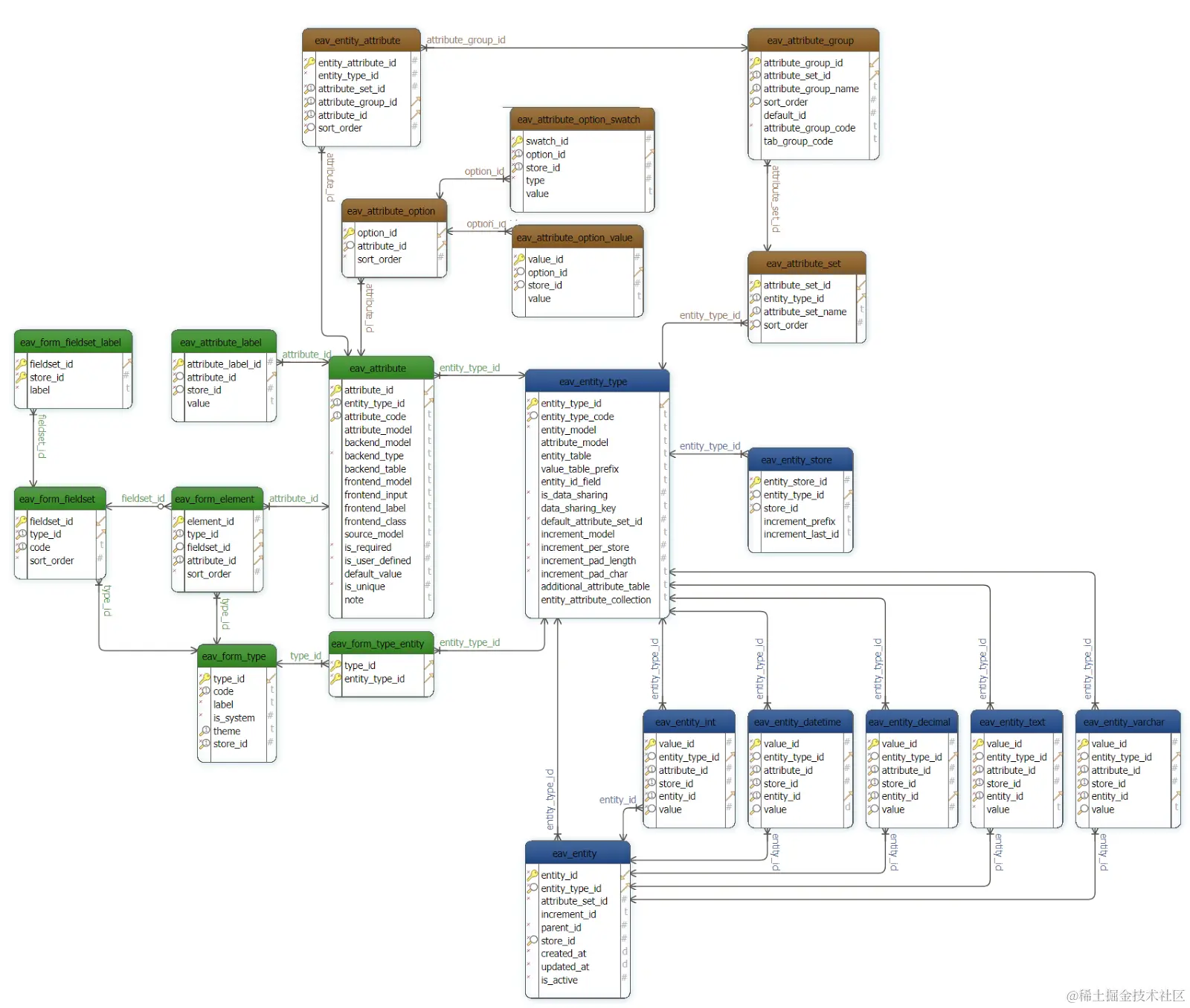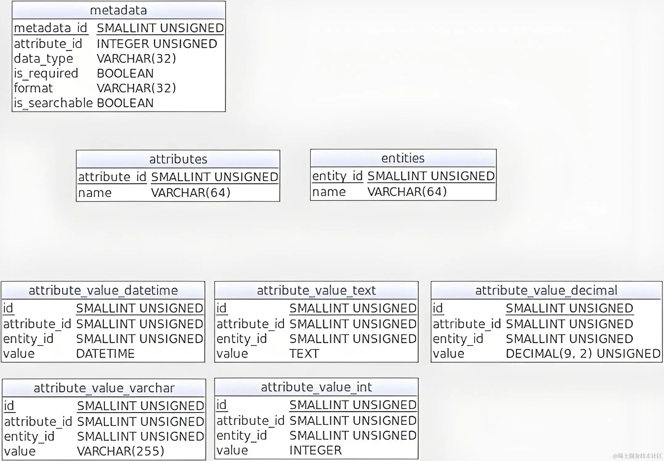 我们可以借鉴magento的eav模型,它是EAV设计的最优参考了。Magento 2中的EAV属性类型有下面这些表: