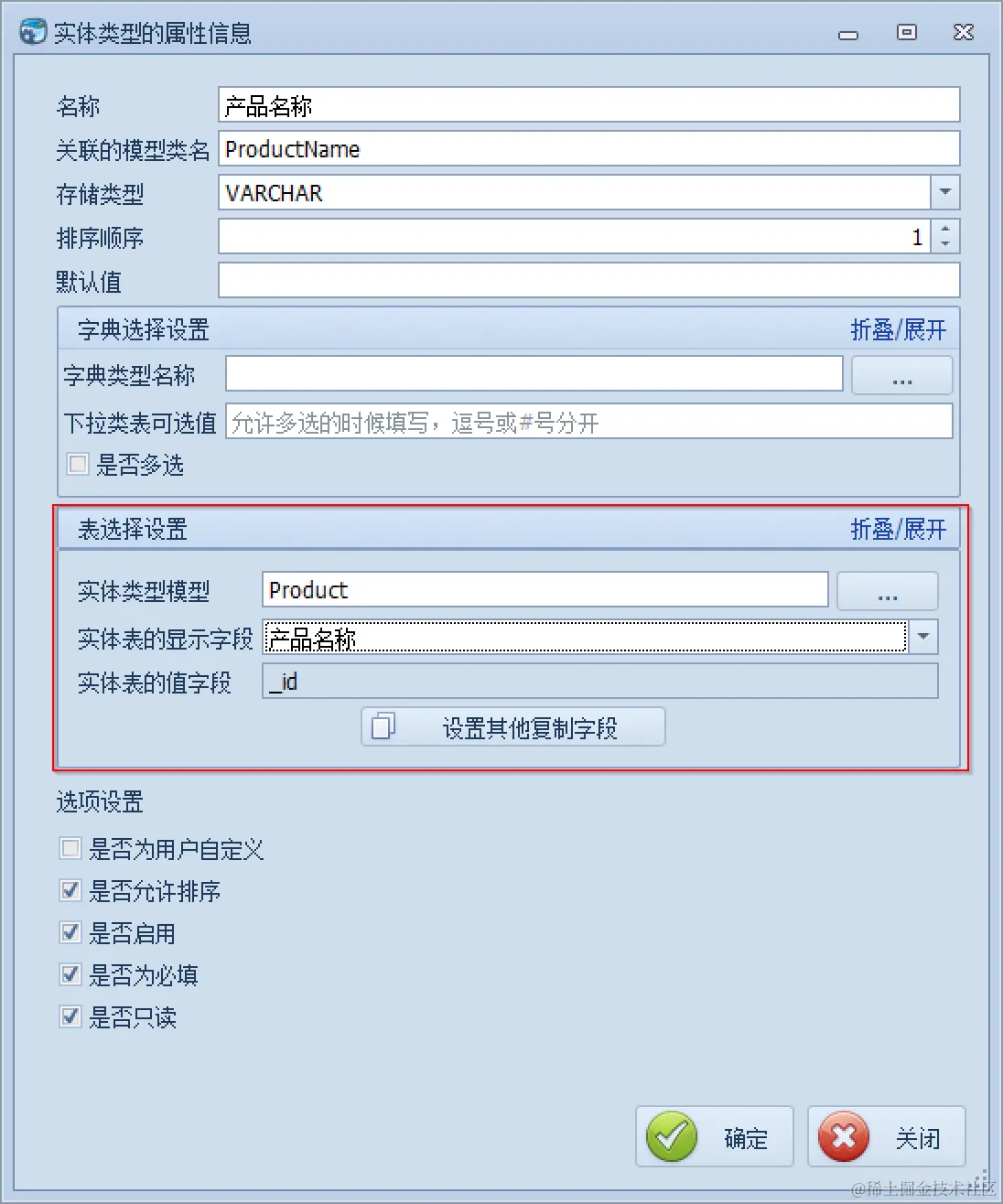 我们在订单明细表中选择表的设置,我们可以再明细表格中动态进行数据的选择处理, 并可以设置关联复制的属性字段,如下界面所示。
