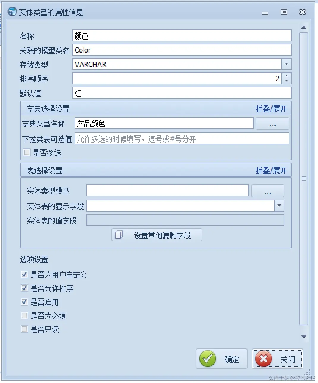 属性定义,除了指定属性的一些名称、排序、默认值、属性值存储类型外,还可以设置是否为字典列表、或者从其他类型表中选择等处理。