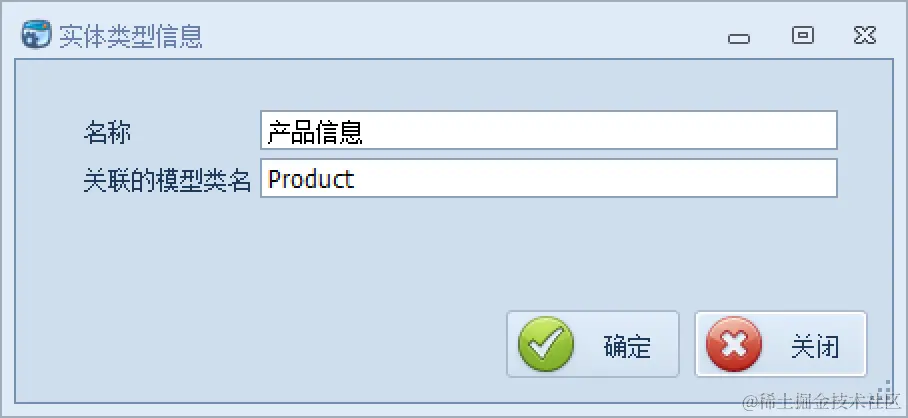 我们新增实体类型的时候,只需要填写简单的信息和类名即可,如果对于产品的定义。
