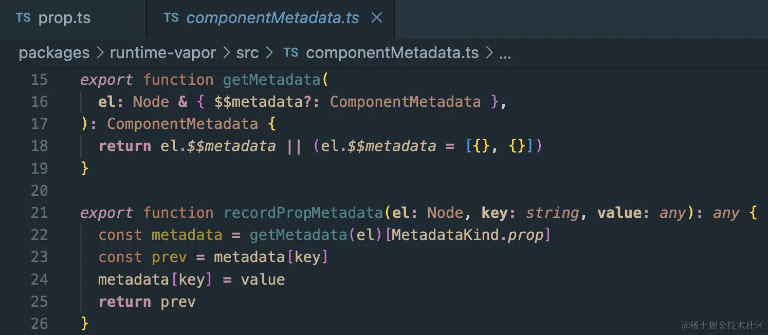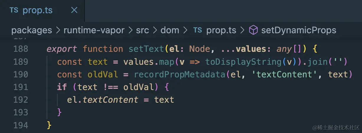 接下来我们来看与更新 DOM 相关的 setText 方法,它的实现在 packages/runtime-vapor/src/dom/prop.ts 文件中
