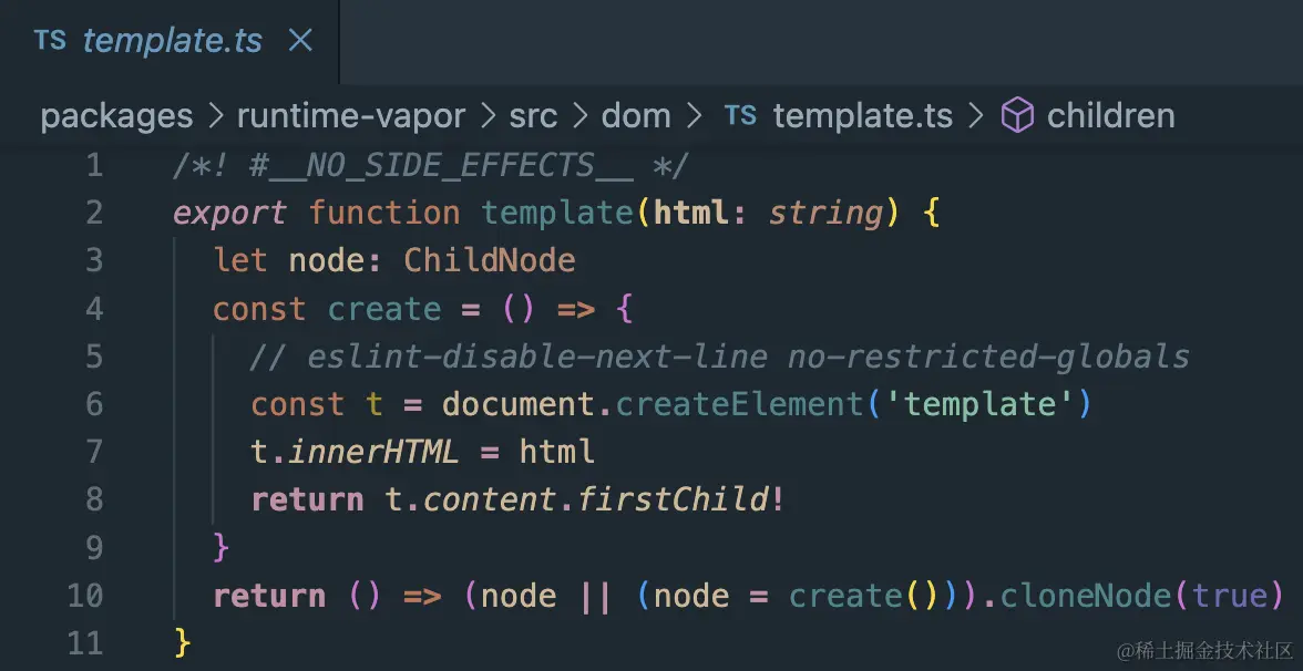 template 方法的实现在 packages/runtime-vapor/src/dom/template.ts 中