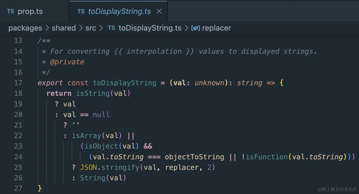 「toDisplayString」方法实现如下,核心就是兼容处理 values 中的 非字符串 类型,会将引用类型(数组,对象)序列化为可展示的字符串