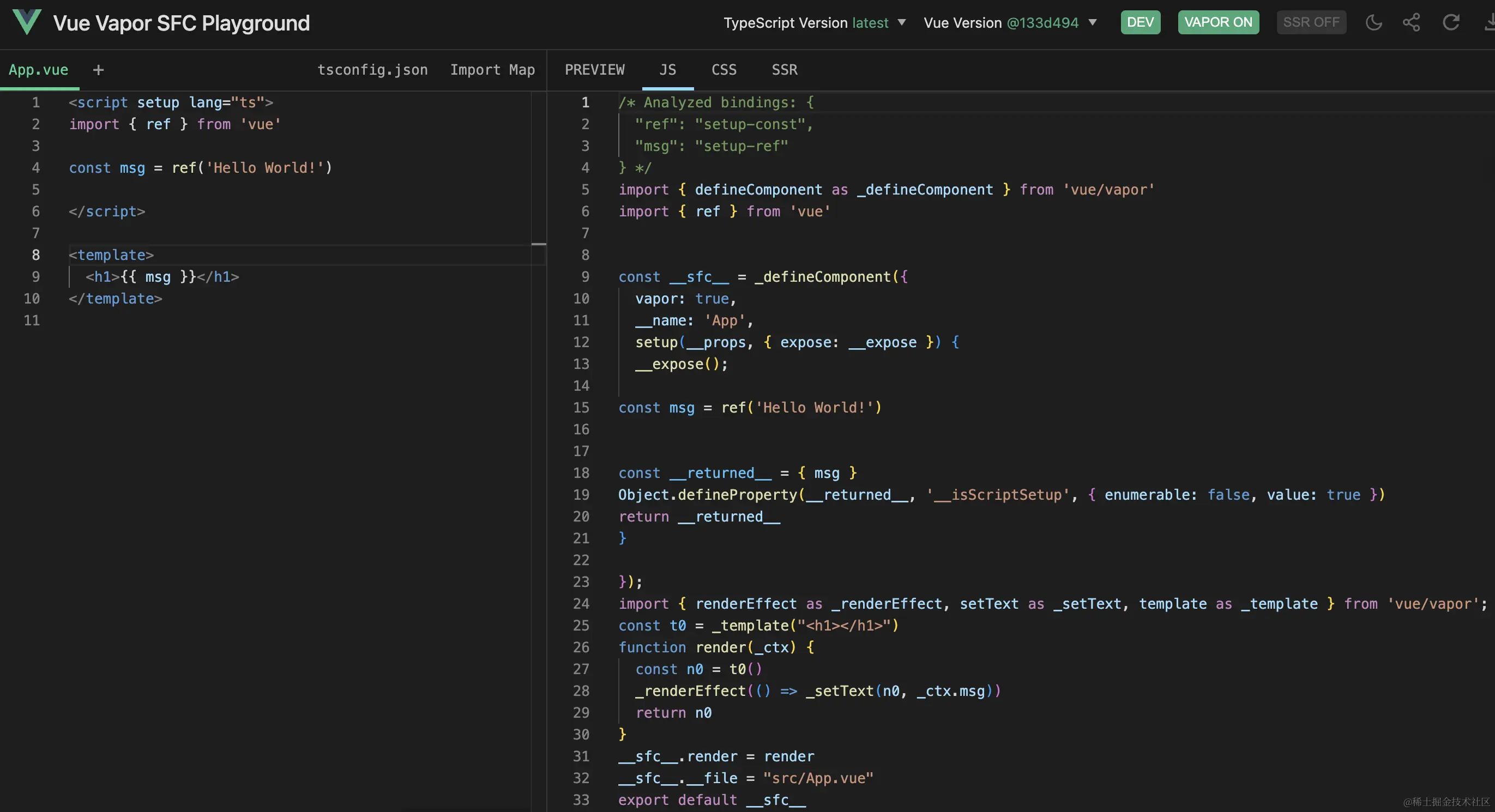 经过前面的铺垫,相信大家对 Vapor mode 都有了基本的了解,但可能还是不够具象,因为日常开发过程中使用 Vue 技术栈的同学对「虚拟DOM」的版本有着实打实的体验,但对 Vapor mode 还只在理论阶段