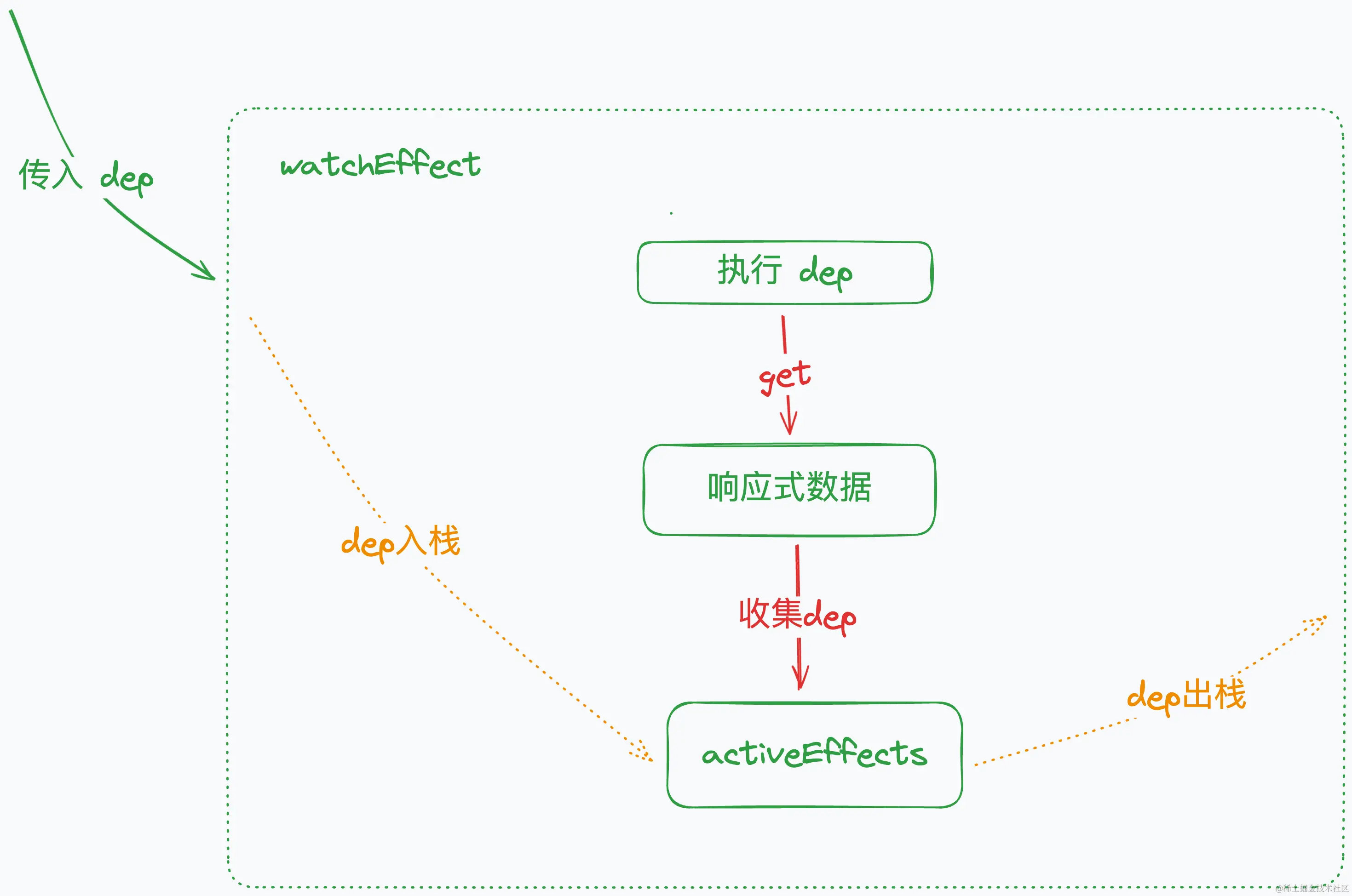 其实很简单,通过上面的示例相信大家已经理解了,只需要在 watchEffect 中,在执行 dep 之前将它推入到一个 栈 中存储起来,当 dep 执行完之后再将其出栈,这样能实现在 dep 函数的「执行上下文」中,任何逻辑都能访问到当前正在执行的 dep 了
