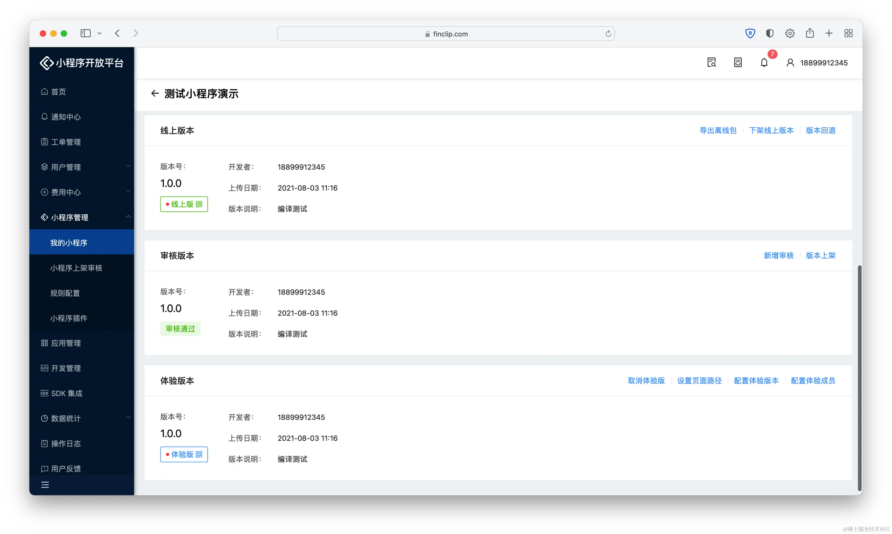 目前,我常用的是FinClip 小程序管理平台,用这个平台的原因是我们通过在app中内嵌小程序容器,可以把小程序应用投放到几十个流量app中,然后,通过小程序管理平台进行上下架、审核、版本管理等等。去年,官方更新了功能,目前已经在可以管理后台中同步管理微信小程序。减少了我一大半的工作。