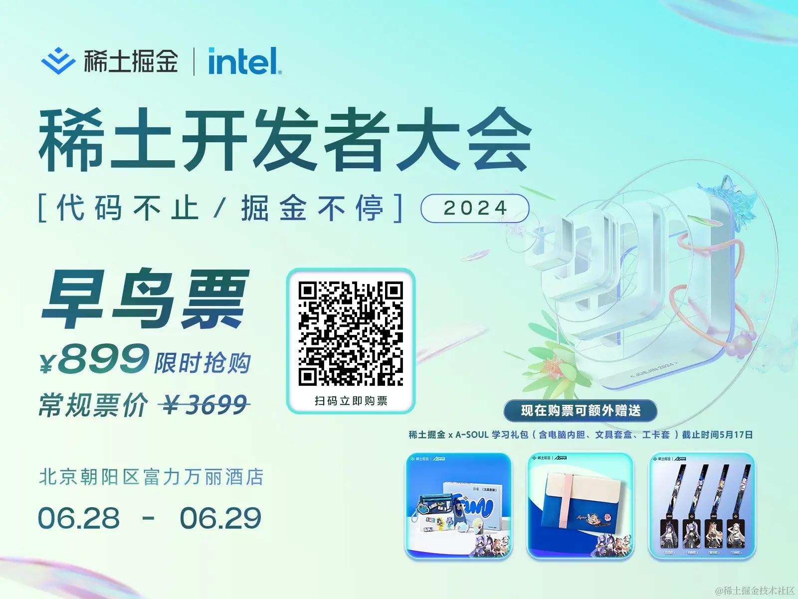 6月10日前购买早鸟票可获得2日午餐券和稀土掘金x A-SOUL学习礼包!(内含电脑内胆包+文具套装礼盒+工卡套),活动现场领取~