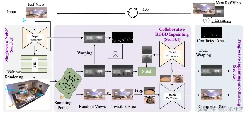 具体来说,给定一张 2D 全景图,我们使用单目深度估计器来预测其深度图,并将输入视图(RGB+depth)作为初始化来训练 NeRF。然后利用一个协作 RGBD 修复模块进行不可见区域填补,该模块包含一个深度估计器和一个稳定扩散模型 (StableDiffusion),从而将 NeRF 扩展到随机视角渲染。