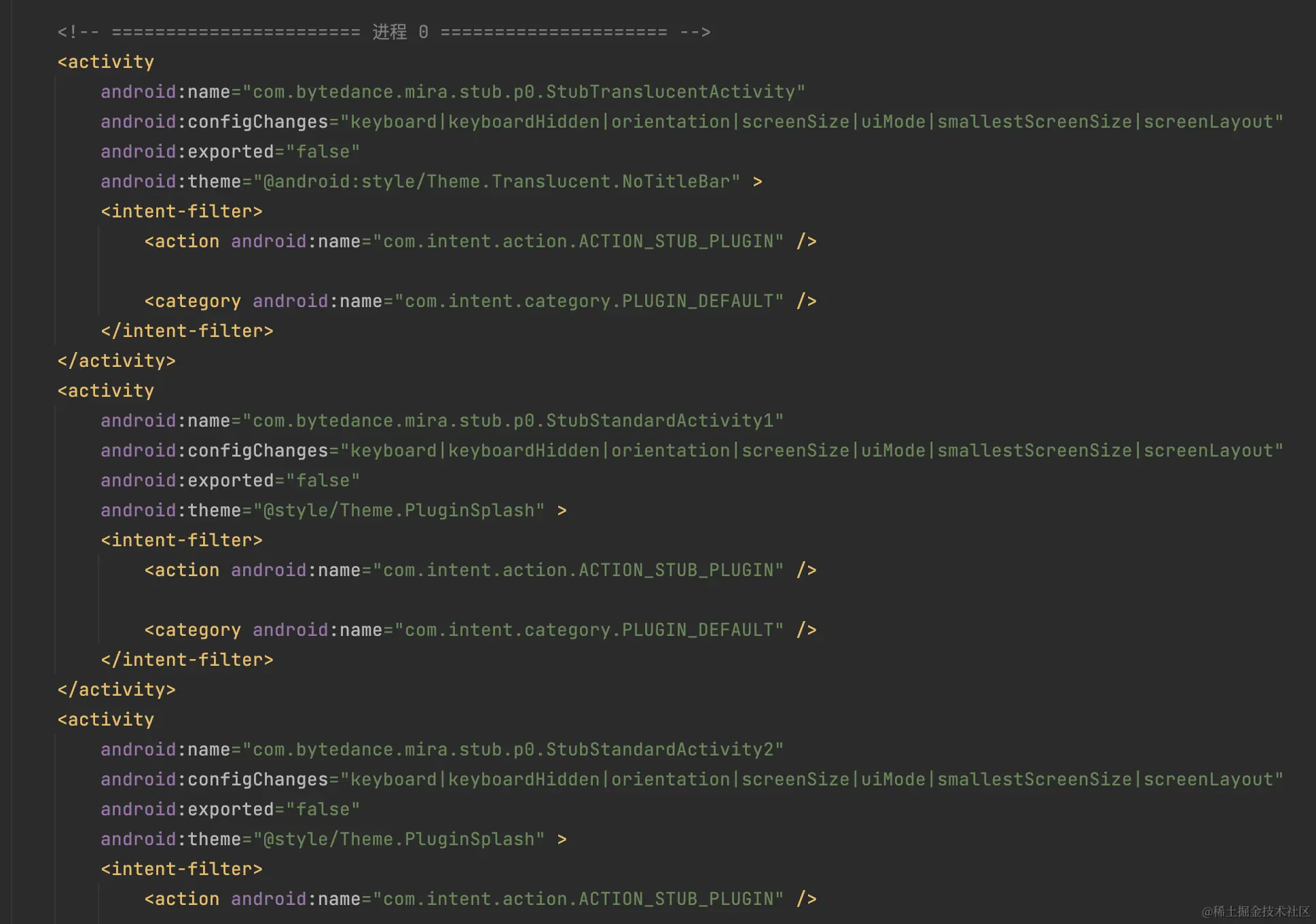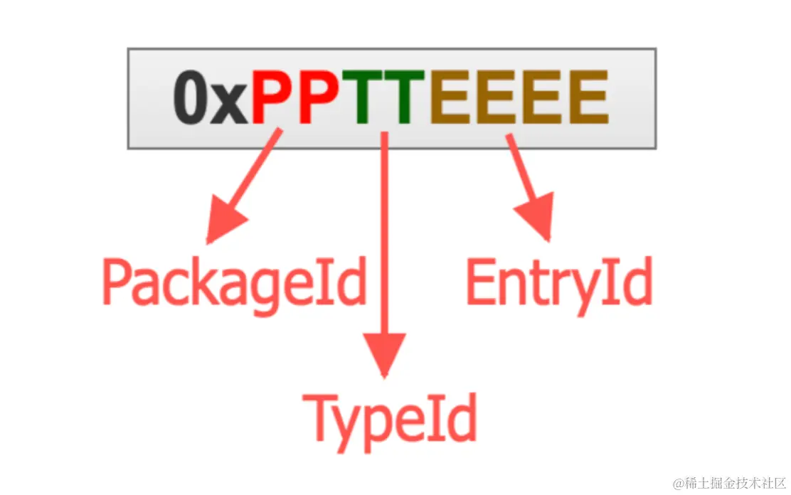 Java代码通常通过资源ID(Int值)来访问具体资源,资源id是由4个字节组成,用十六进制表示:0x PPTTEEEE,其中PP代表命名空间,TT代表资源类型(animator、anim、color、drawable等),EEEE代表的是每一个资源所出现的顺序。我们打包时的资源PP值默认都是7F,就会导致插件和宿主的资源冲突: