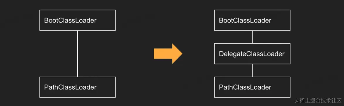 但如果我们想让宿主类可以直接加载插件类,那需要宿主类的classloader具备加载插件类的能力。在Android中呢,默认用PathClassLoader来加载宿主APK中的类,其Parent为BootClassLoader来加载系统的类。SDK自定义一个新的类DelegateClassLoader实现对插件类的加载,并将其插到PathClassLoader与BootClassLoader之间