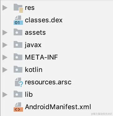 如下图,Apk中有classes.dex、res资源、assets资源、resources.arsc、naitve lib、AndroidManifest.xml等,这些也都是用来承载我们需求功能的文件,那我们一个完整的插件化框架就需要支持以下文件的单独运行。