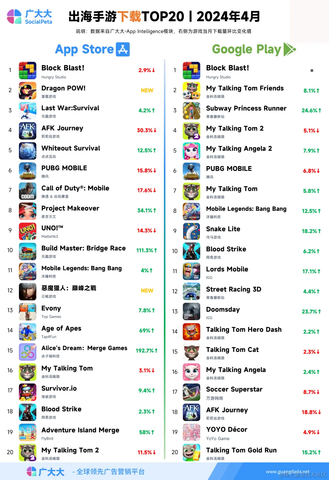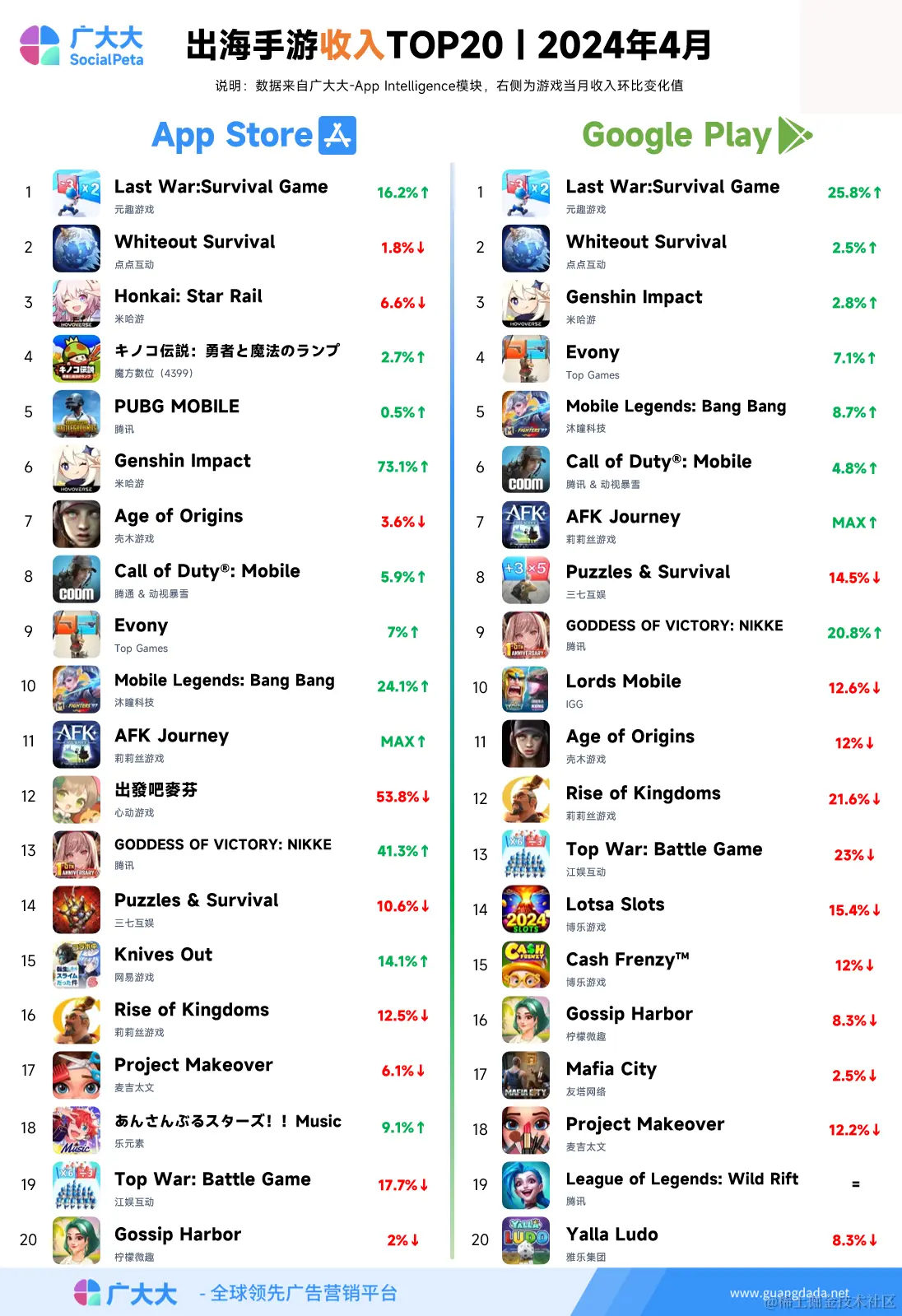 根据广大大——App Intelligence等模块数据,我们整理出2024年4月成功出海手游投放、收入和下载TOP20榜单,帮助更多出海手游从业人员了解全球移动市场变化趋势。